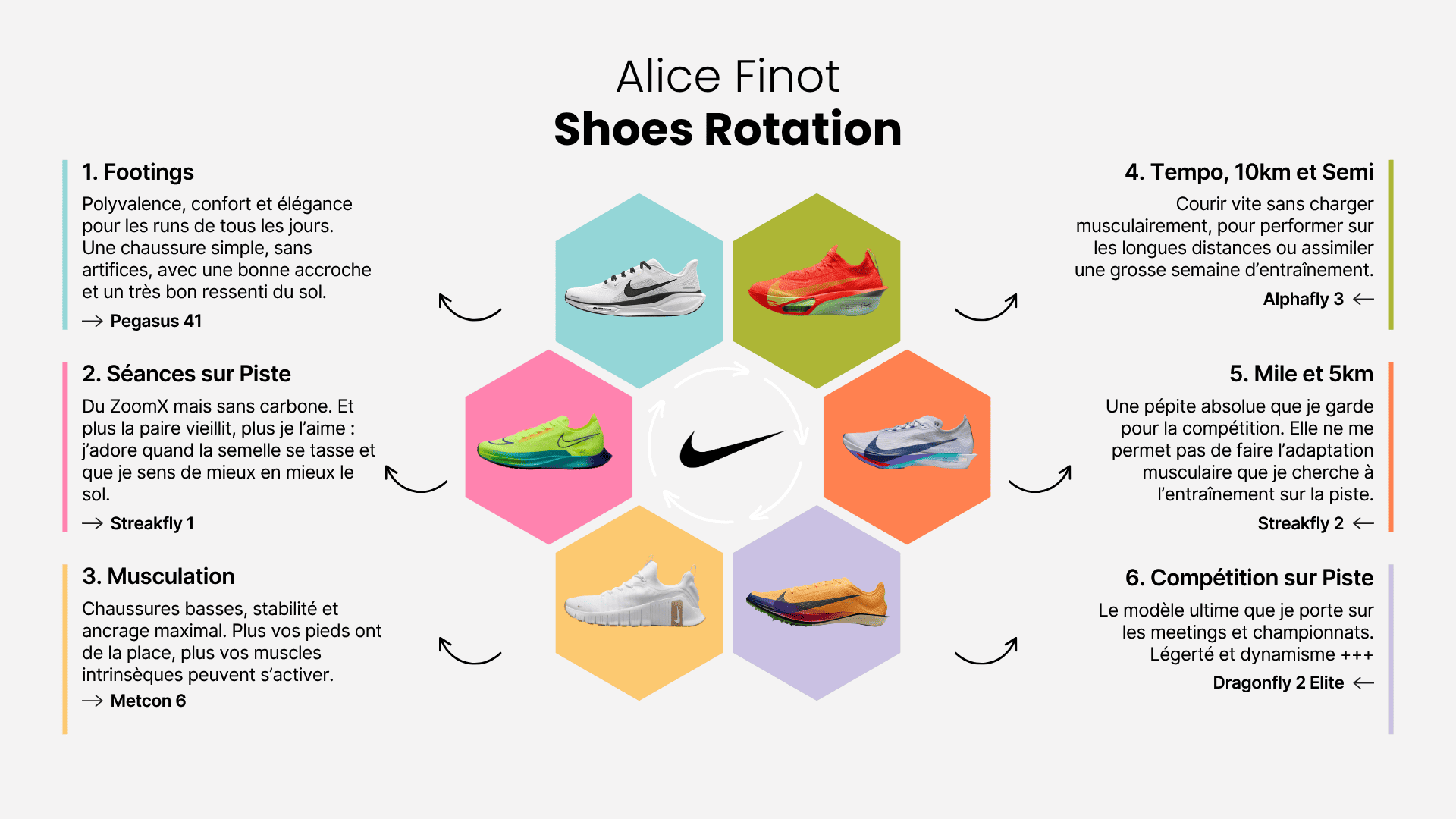 Donc vous l’avez compris : les carbones, ce n’est pas au gymnase qu’on les sort. Même si j’ai déjà vu des athlètes pros le faire. Une bonne paire de Metcon fait le job depuis mes débuts chez Nike, et je n’ai jamais changé de modèle : suffisamment souple pour permettre des transferts après la muscu, foulées bondissantes, travail de pied, haies…